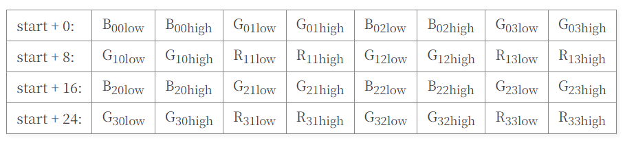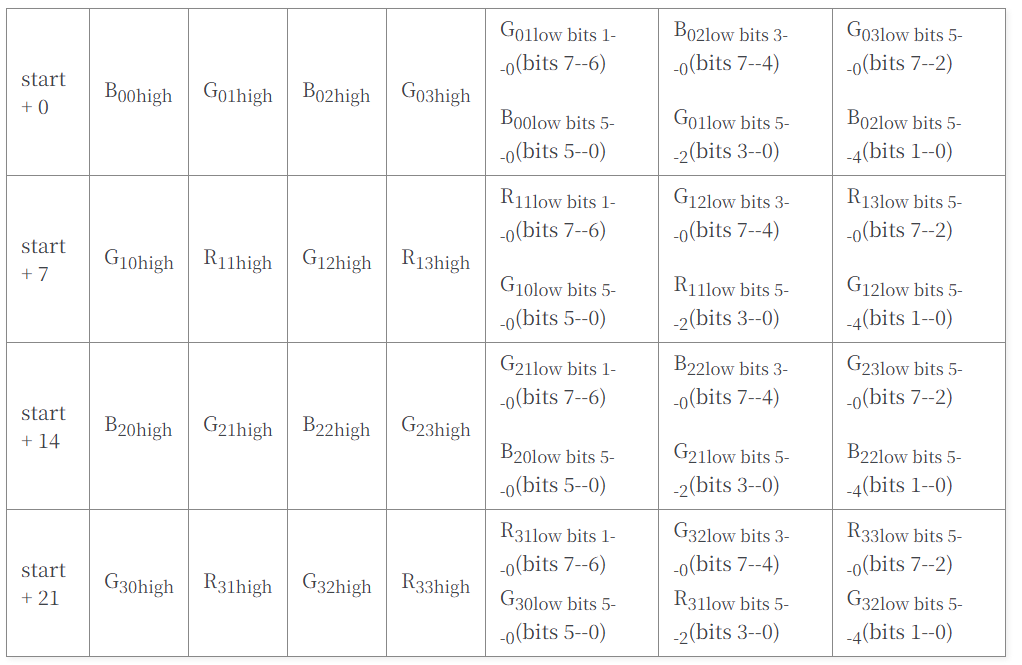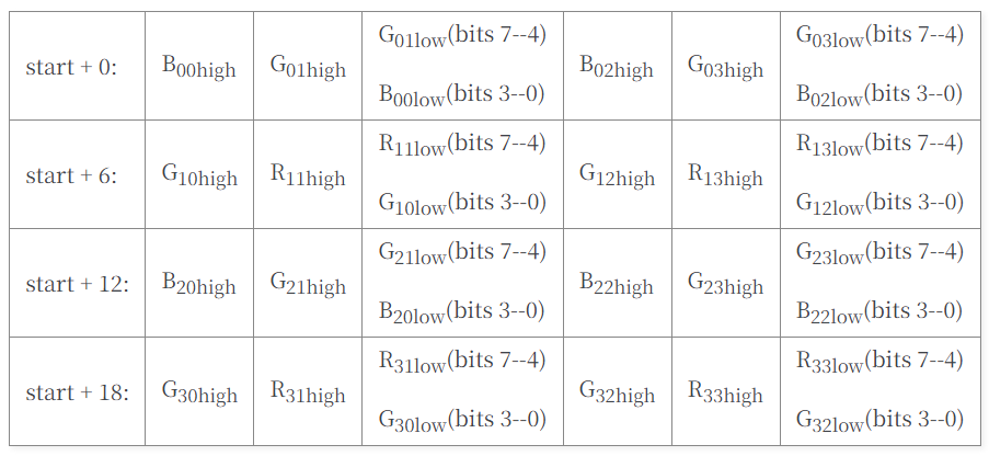 每个采样 12bits,每 2 个 pixels 合并为 3bytes. 第 3 个 byte 保存前两个 pixel 的低 4 位。