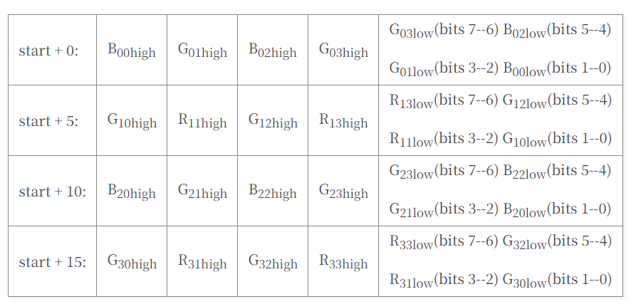 每个采样 10 bits, 每 4 个采样合并为 5 bytes。第 5 个 byte 保存前四个 pixel 的低两位。